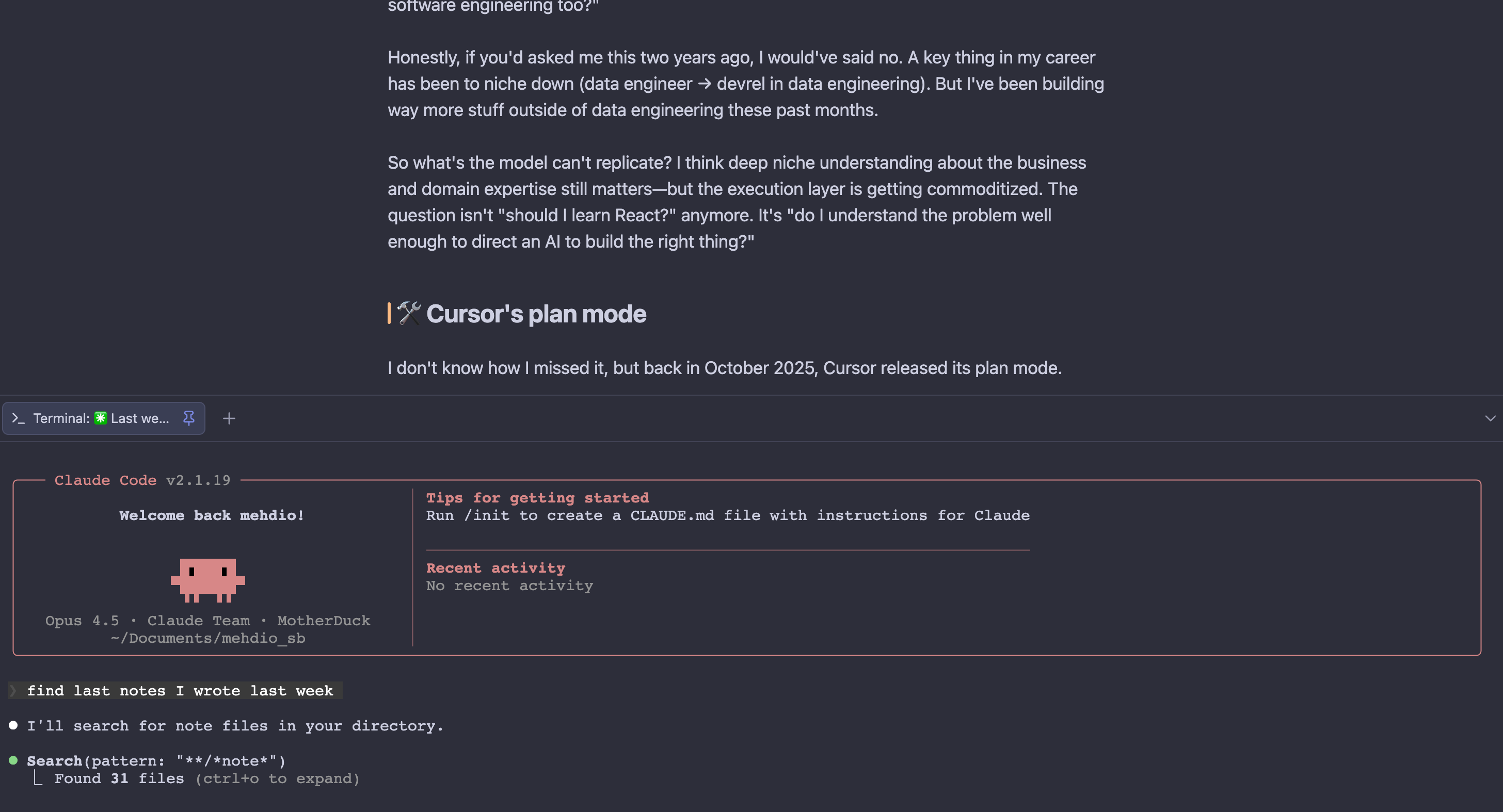 Iāve been playing with the Terminal community plugin for Obsidian to leverage more AI within Obsidian. Not necessarily for writing, but rather for linting and searching. Yes, Obsidian has good search mechanisms and Dataview (so the query I show in the screenshot is actually pretty basic). But Iām looking more for skills like āadd a summary of this large noteā or āfill in the missing metadata from the source URL.ā