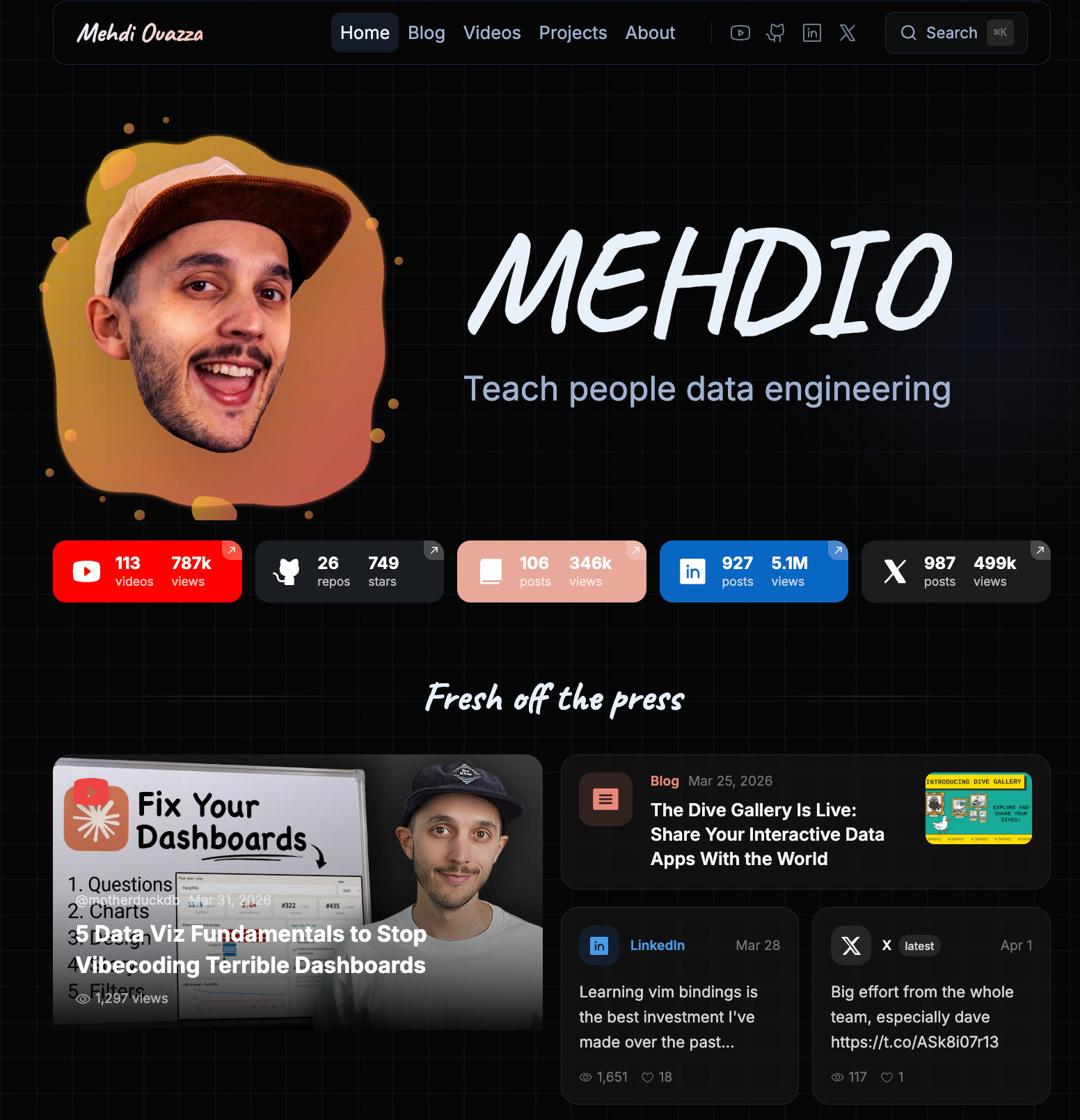 Whether it’s figuring out which MCPs are actually useful, turning repetitive tasks into skills, or automating pipelines that would’ve taken too long to do manually and this is where I’ve been putting my energy. One big piece: all my content is now a hub on mehdio.com with stats updated daily.
