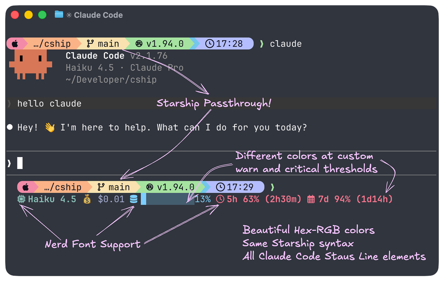 CShip is a nice little plugin for Starship that shows more information about Claude Code. I was already a Starship user, so adding this was a no-brainer. At least now I can see when I’m burning too much $$.
