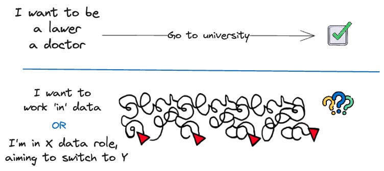 In the world of data, things are a bit more complicated. Through my mentoring experience, I've noticed that young graduates or those shifting careers often express a desire to work in data, AI, or ML. However, they usually don't have a clear idea of what they want to do. They might have some guesses about their interests, but mostly, they just want to break into the industry.