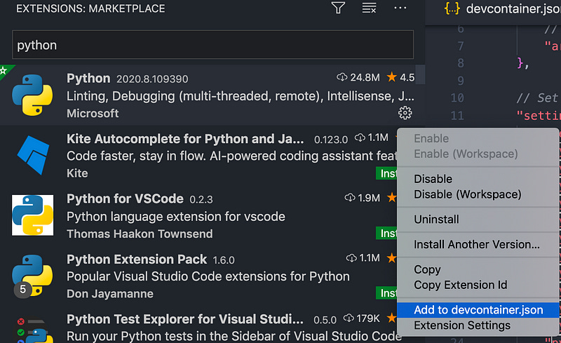 Note that an extension name is a unique name provided in the extensions store. To add these, the easiest way is to go to your extensions panel in VS Code, click on the setting button, and “Add to devcontainer.json”.