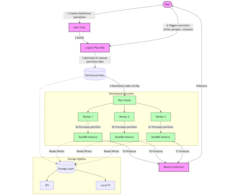 Ray-powered distribution – Each task runs in its own DuckDB instance for parallel execution.