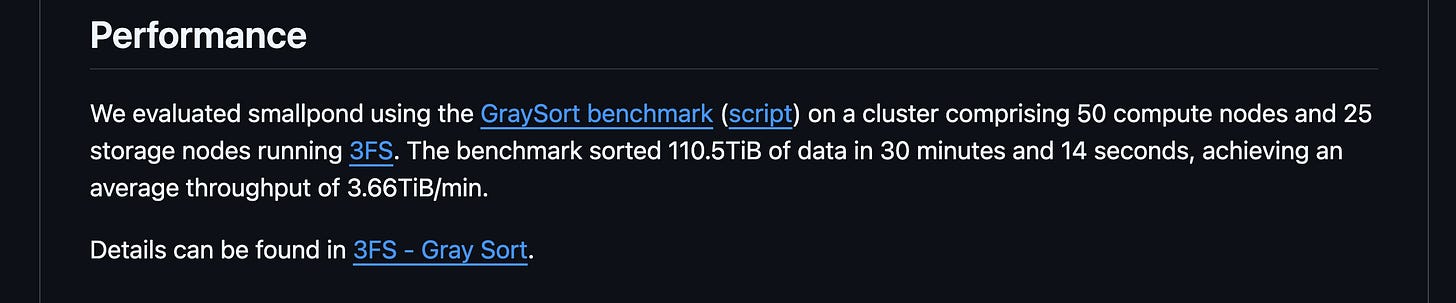 While smallpond supports local filesystems for development and smaller workloads, the benchmark on 100TB mentioned is actually using the custom DeepSeek 3FS framework: Fire-Flyer File System is a high-performance distributed file system designed to address the challenges of AI training and inference workloads.