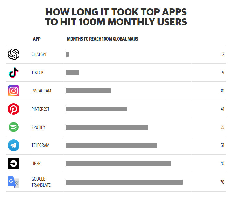 ChatGPT has become the user interface of AI, democratizing access for anyone who can type on a laptop - and it's free. It's also the fastest-growing application in history, reaching 100 million users in just two months.