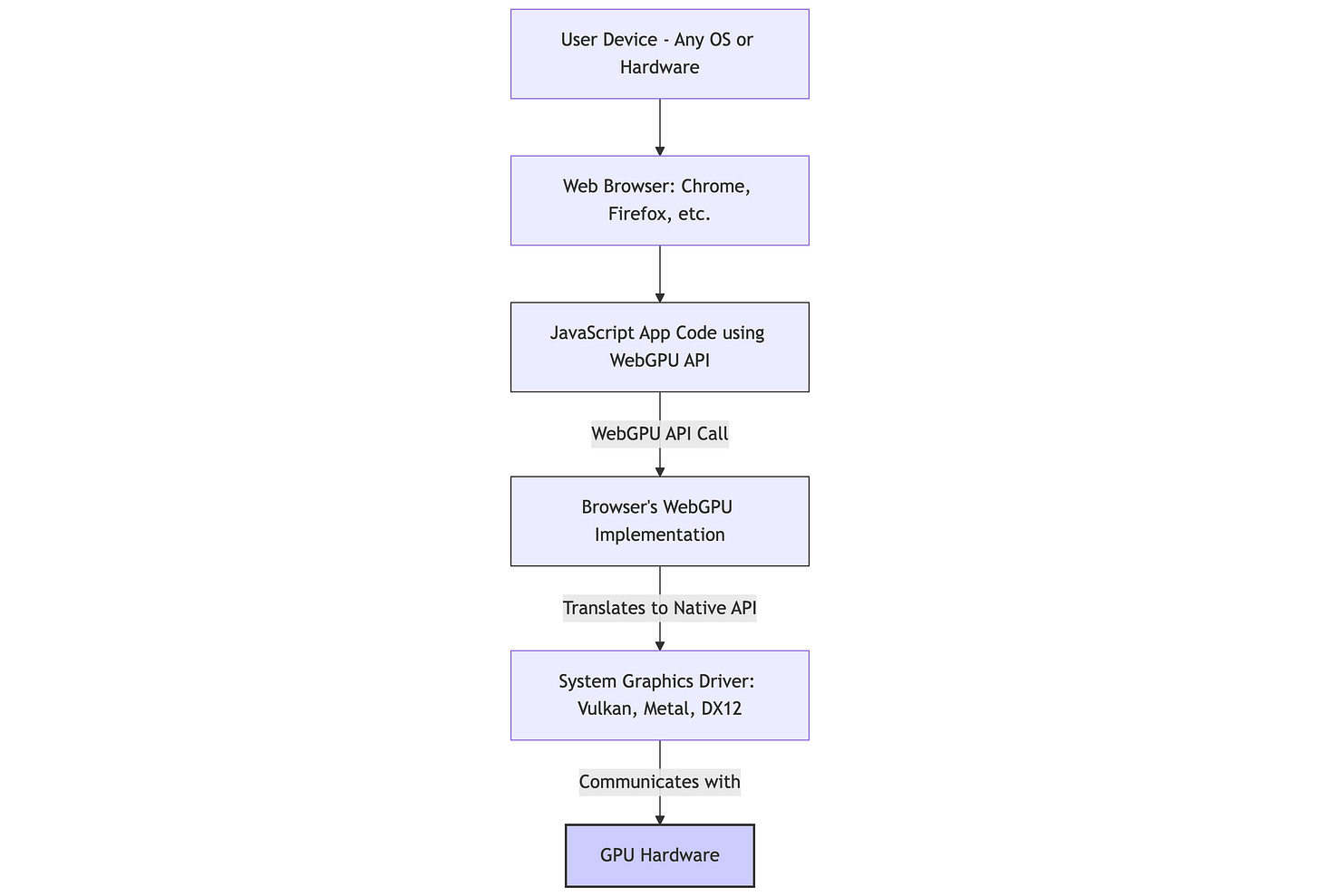 They make these GPU-accelerated applications potentially runnable on any device with a compatible browser, accessible via a simple URL. The browser, through its WebGPU implementation, handles the communication with the underlying native graphics drivers (Vulkan, Metal, DirectX 12).