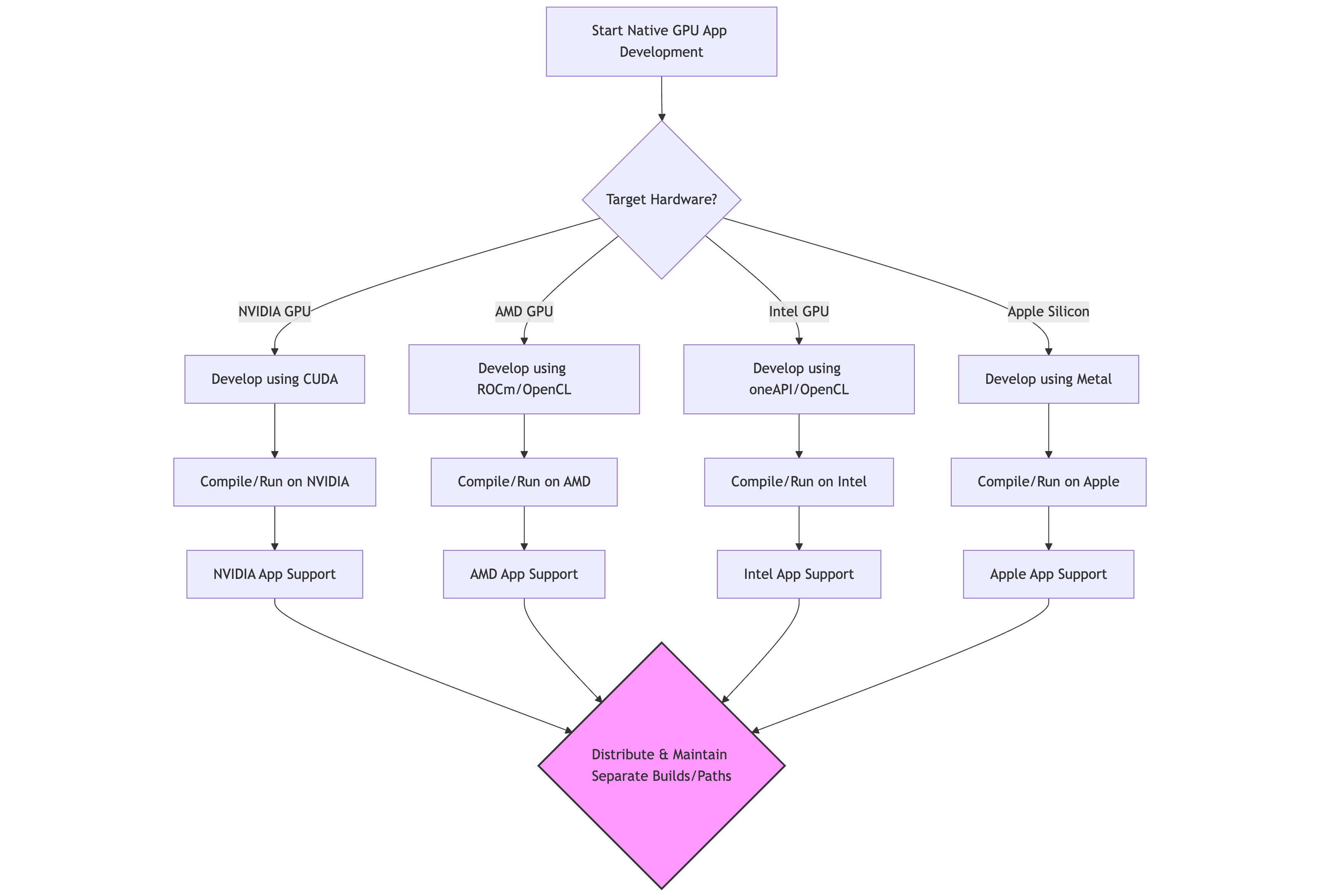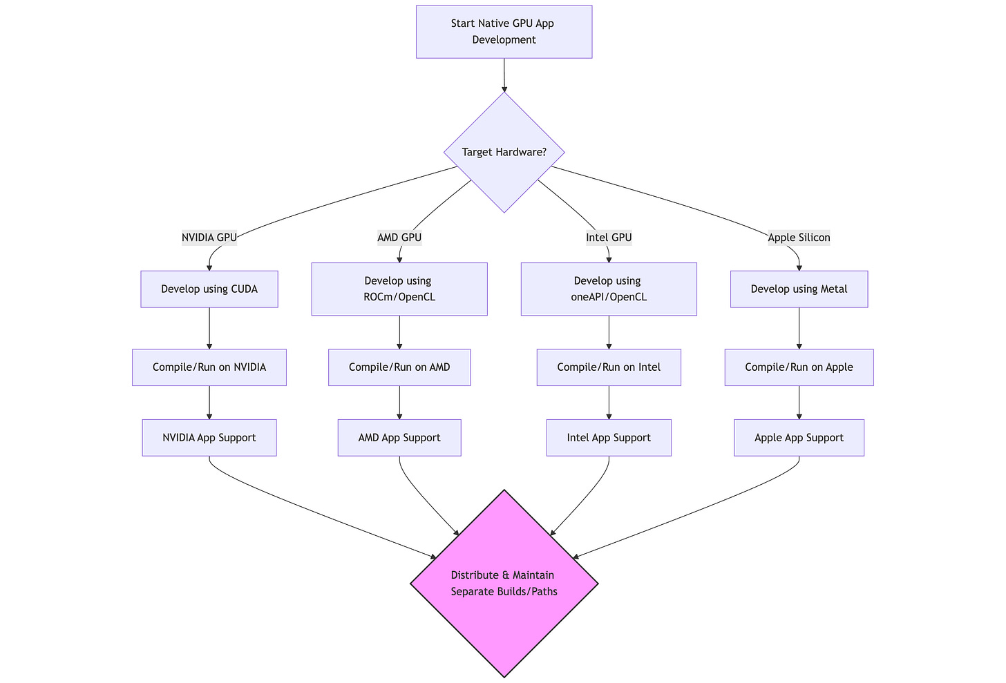 So while you can develop native AI applications targeting specific operating systems, you often end up tied to particular GPU vendor integrations or managing multiple complex build targets. On macOS, Apple Silicon provides a somewhat unified target, but across the wider PC ecosystem (Windows, Linux), the hardware landscape is diverse.