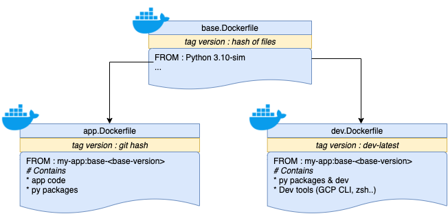 To respect the dependency (base → dev and base → app) between docker layers, we can add a simple if/else case so that the base layer is always built upfront no matter which layer we are requesting.